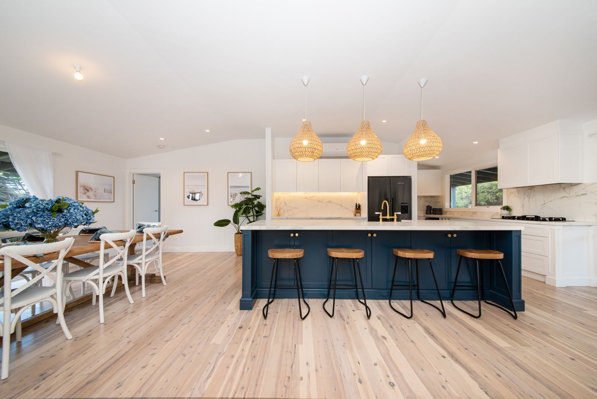 Inside, the open plan living/dining area is impressively proportioned and served by a lavish kitchen featuring striking stone surfaces, huge breakfast bench and quality cooking appliances.